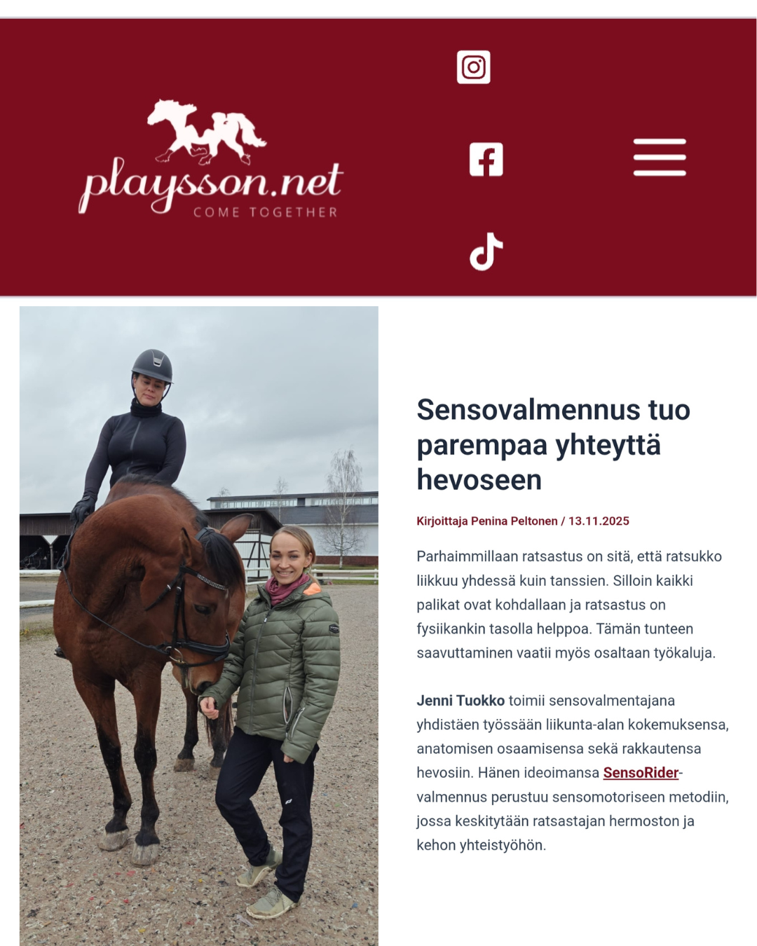 Julkaisujen kautta avautuvat sekä menetelmän periaatteet, että tarinat käytännön työn takaa – se, miten hermoston, kehon ja ratsastuksen yhteys näkyy valmennuksessa & arjessa. Ja mikä on tuonut Senso Riderin ja Jennin tähän hetkeen.